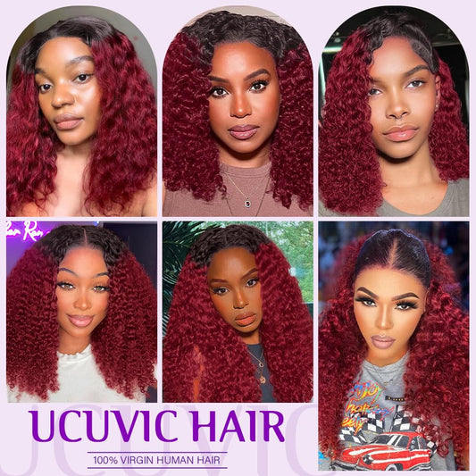 UCUVIC Glueless Wigs Human Hair Pre Plucked Pre Cut Wear And Go Curly 5x5 Deep Wave Bob Wig Human Hair Lace Front Closure Wigs For Black Women 200 Density Curly Wig Glueless Ombre Burgundy 14 Inch