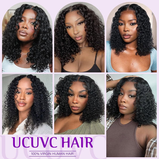 UCUVIC Glueless Wigs Human Hair Pre Plucked Pre Cut Wear And Go Curly 5x5 Water Wave Bob Wig Human Hair Lace Front Closure Wigs For Black Women 200 Density Curly Wig Glueless Wear And Go Black 14 Inch
