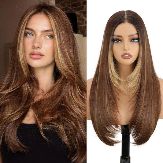 NOSTALGIA Brown and Blonde Highlight Straight Lace Front Wig Pre Cut Glueless Synthetic Layered Wig 24 Inch Middle Part Closure Wig For Women Upgraded with Premium Fiber