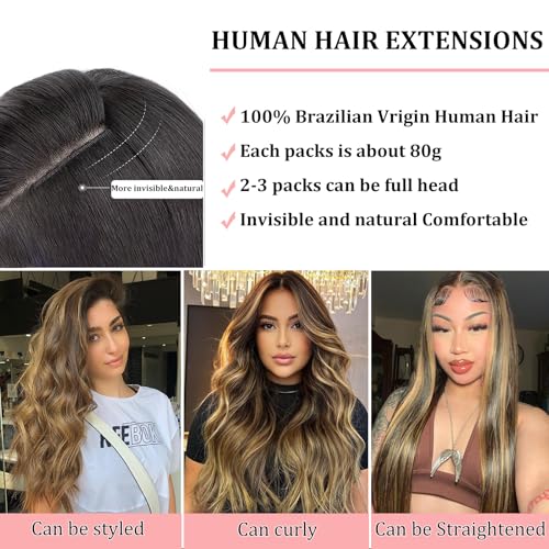 Clip in Hair Extensions Real Human Hair, Remy Human Hair Clip in Extensions Double Weft Seamless Clip ins Hair Extension for Women Balayage Natural Black Mixed Chestnut Brown 16 Inch 2.8oz/80g