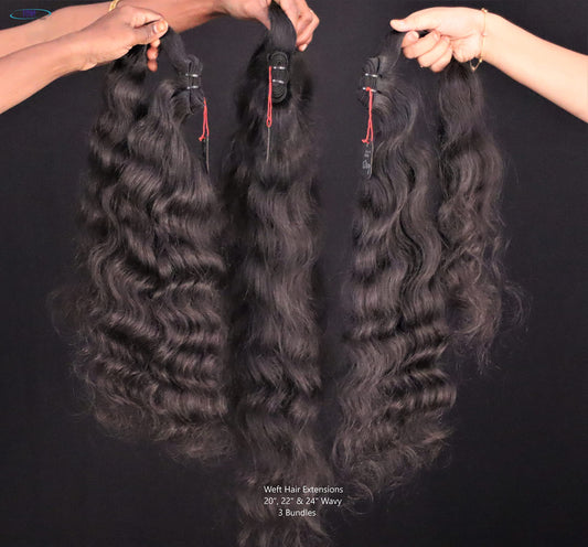 IDM INDIA 3 Bundles of 20” 22” 24” Wavy 100% natural Indian virgin temple raw hair extensions unprocessed and not treated with any kind of chemicals. Single donor raw hair weft bundles