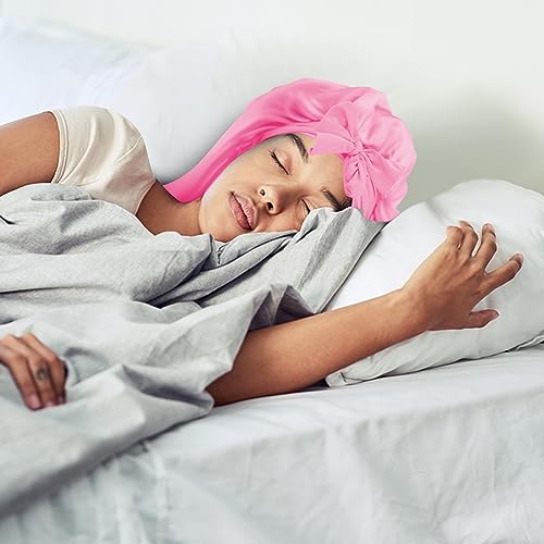 PLUMXUE Long Silk-Satin Hair Bonnet - Extra Large Sleeping Cap for Women Braid Curly with Adjustable Tie Band and Scrunchies (Pink)