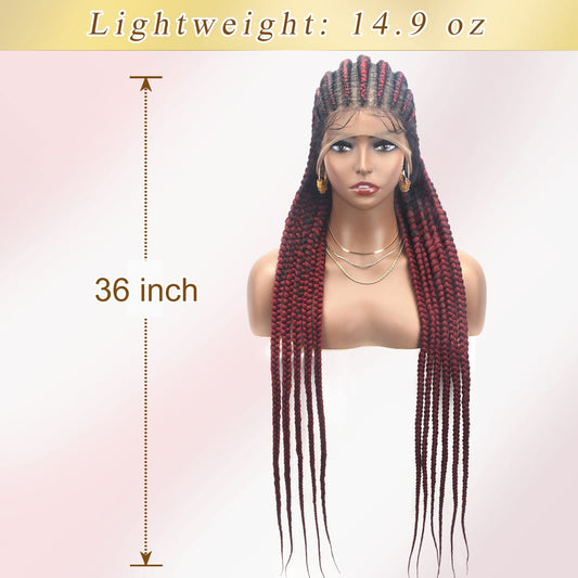 Alebery 36" Full Lace Knotless Box Braided Wigs for Black Women Knotless Box Braids Lace Front Wig with Baby Hair Lightweight Synthetic Lace Frontal Burgundy Cornrow Twisted Braided Wigs (1B/BG)