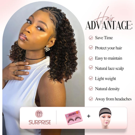 Fancy Hair Braided Wig Cornrow with Curly Hair Wig HD Lace Front Wig with Baby Hair Pre Plucked Glueless Transparent 13x4 Inch Highlight Brown Wig for Black Women