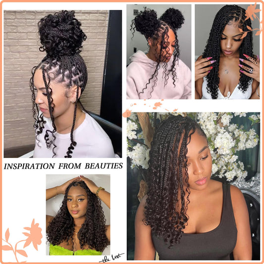 Suntefic Knotless Boho Box Braided Wigs for Black Women Glueless Double Full Lace Front Human Hair Blended Goddess Braid Wig with Baby Hair Bohemian Curly Ends (Boho Box-#1BT350, 28 Inch)