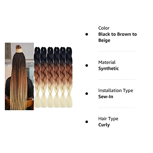 SHUOHAN 6 Packs Ombre Jumbo Braiding Hair Extensions 24 Inch High Temperature Synthetic Fiber Hair Extensions for Box Braids Braiding Hair (Black to Brown to Beige)