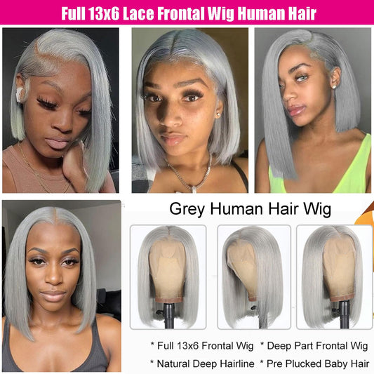 CUEKT 13x6 Grey Bob Lace Frontal Wig Human Hair Short Straight Transparent Front Wig Natural Density Pre Plucked Hairline Colored Gray Bob Wigs for Women 12 Inch