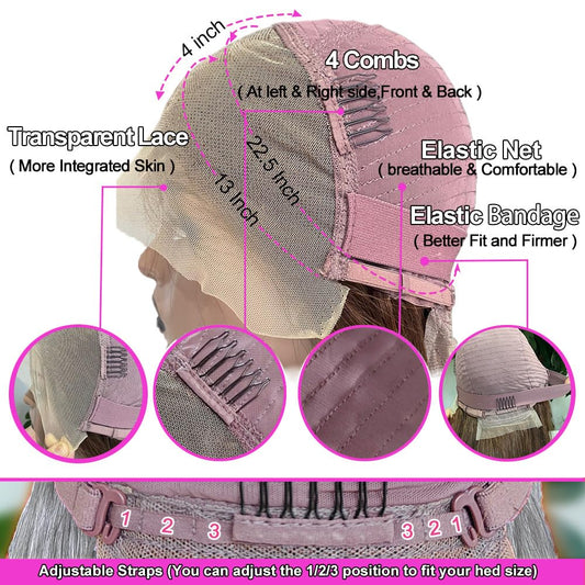 CUEKT 13x6 Grey Bob Lace Frontal Wig Human Hair Short Straight Transparent Front Wig Natural Density Pre Plucked Hairline Colored Gray Bob Wigs for Women 14 Inch