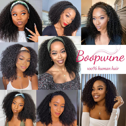Kinky Curly Headband Wig Human Hair 20 Inch Headband Wigs for Women Human Hair Glueless None Lace Front Curly Wave Wigs Brazilian Virgin Hair Wear and Go Glueless Wig 150% Density Natural Black Color