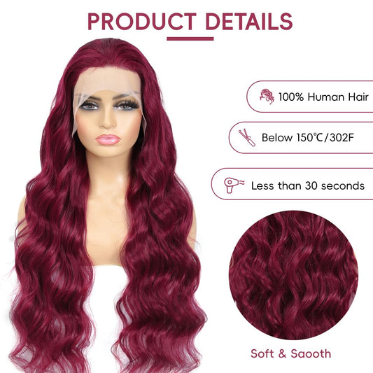 99j Burgundy Lace Front Wigs Human Hair 200% Density HD Lace Front Wig Pre Plucked 13x4 Body Wave Glueless 28 Inch
