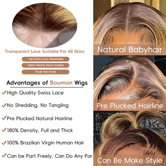 Highlight Ombre Lace Front Wig Human Hair Pre Plucked 200% Density 13x4 HD Transparent Lace Frontal Wigs For Women Body Wave 4/27 Colored Highlight Human Hair Wig 32 Inch