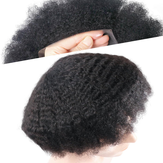 Man Weave Hair Unit for Black Men Curly Afro Brazilian Hair Replacement System Wig for American African Black Men Full Poly Skin All PU Injected Wave Hairpiece (1B# Off Black, 8MM Afro Wave)
