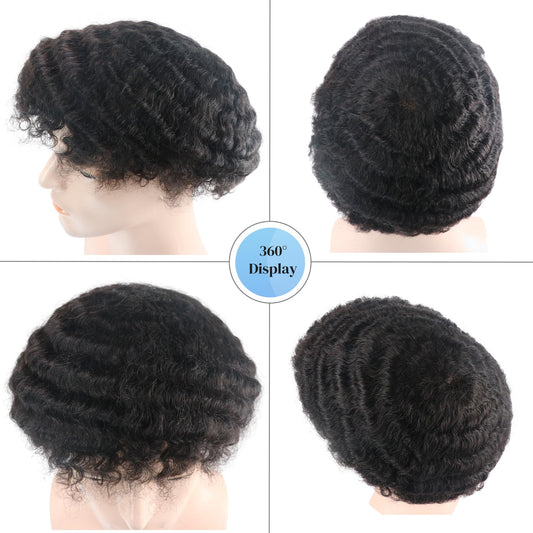 lumeng Afro Toupee PU Base Wig Men 12MM Wave Hair Unit Black Mens Wig 8x10inch Human Hair System 1B# Off Black 360 Curly Replacement Afro Human Hair Pieces