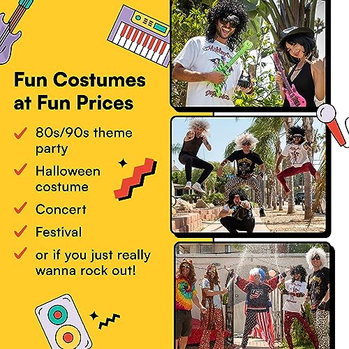 Watt's Wigs - 80s Hair Metal Rocker Costume Set - Glam Rock Band Black Curly Wig with Paisley Print Stretch Fabric Headband, Color Tattoo Sleeve, and Biker Glove - One Size Fits All (Black)