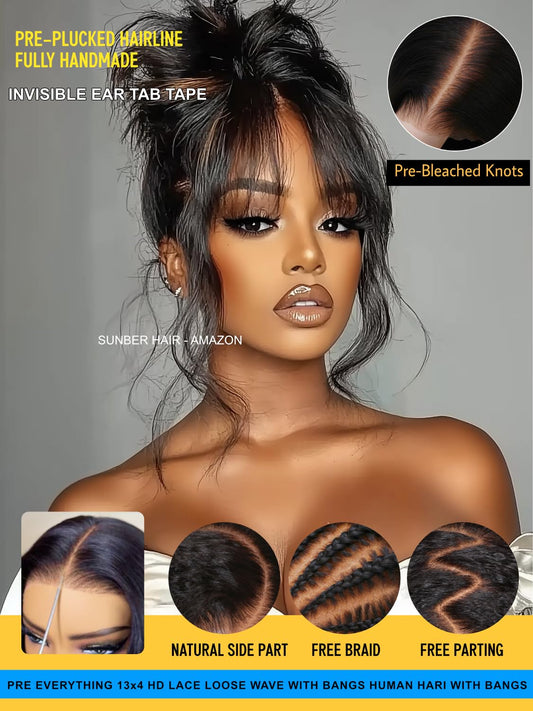 Sunber Bye Bye Knots 7x5 Lace Front Glueless Fluffy Natural Loose Wave Curtain Bangs Wig 180% Density Human Hair Wigs Pre Plucked Invisible Knots Pre Everything 3S Ready to Wear 20Inch