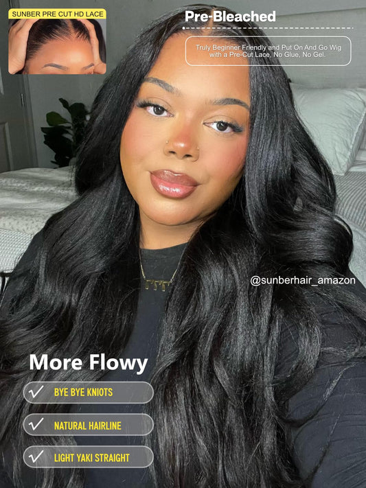 Sunber Yaki Straight Human Hair Bye Bye Knots Pre Cut Lace 7x5 Lace Front Glueless Wig Put On Go Light Yaki Straight Wigs Pre Bleached Invisible Knots 150% Density with Baby Hair 18Inch for Beginner