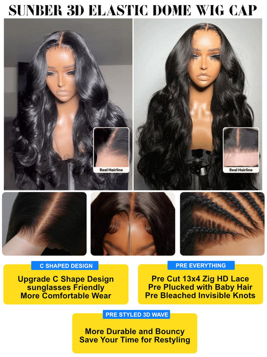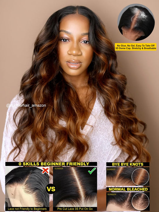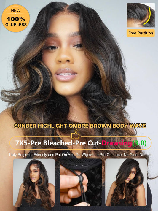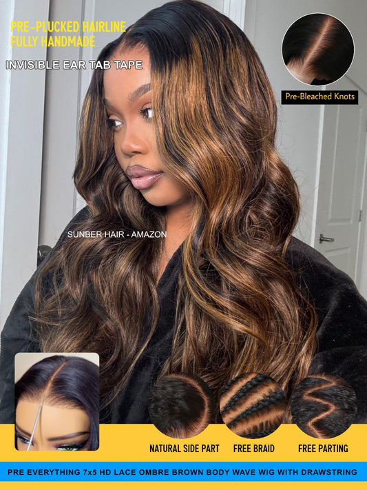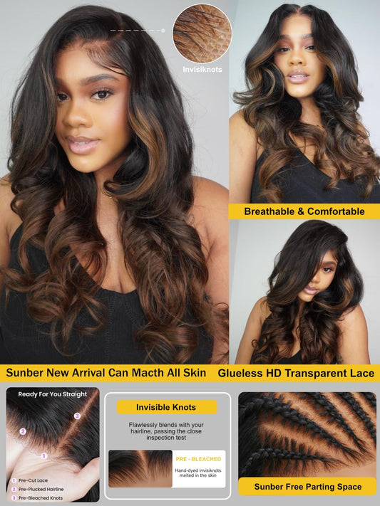 Sunber Ombre Brown Body Wave Human Hair Glueless Highlight Balayage Wigs Pre Cut 7x5 HD Lace Front with Elastic Drawstring 180% Density Put On and Go Pre Plucked Pre Bleached Invisible Knots 18Inch