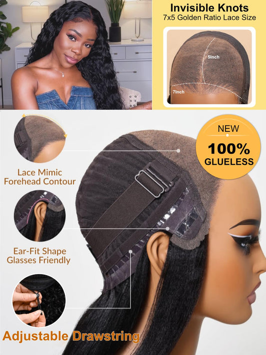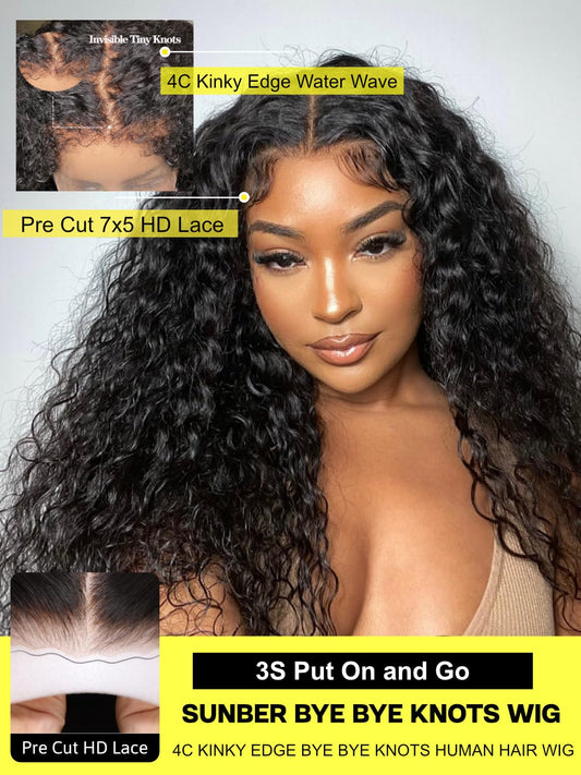 Sunber 4C Kinky Edges Water Wave Human Hair Wigs with Drawstring Bye Bye Knots Pre Cut 7x5 HD Lace Front Water Wave Glueless Wigs Put On and Go Pre Bleached Knots 180% Density 22Inch Beginner friendly