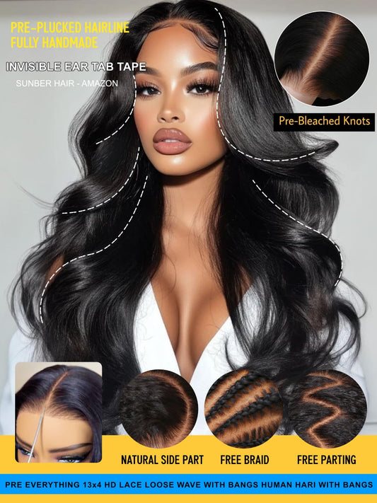 Sunber 13x4 Pre-Everything Wig With Loose Wave Face-Framing Layers And Side-Swept Bangs With Drawstring 180% Density 20Inch