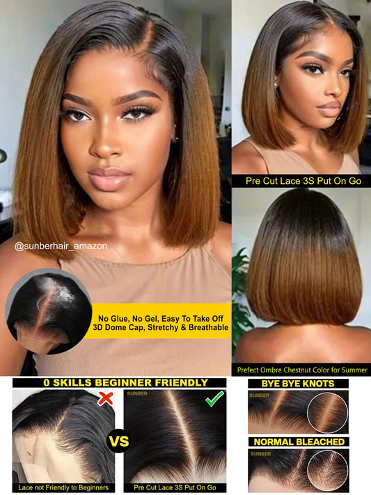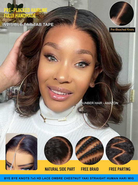 Sunber Ombre Chestnut Brown Light Yaki Straight Bob Human Hair Wigs Bye Bye Knots Pre Cut 7x5 HD Lace Front Lace Put On and Go 3s Wear Glueless Brown Yaki Bob Wig Pre Bleached Invisible Knots 12Inch