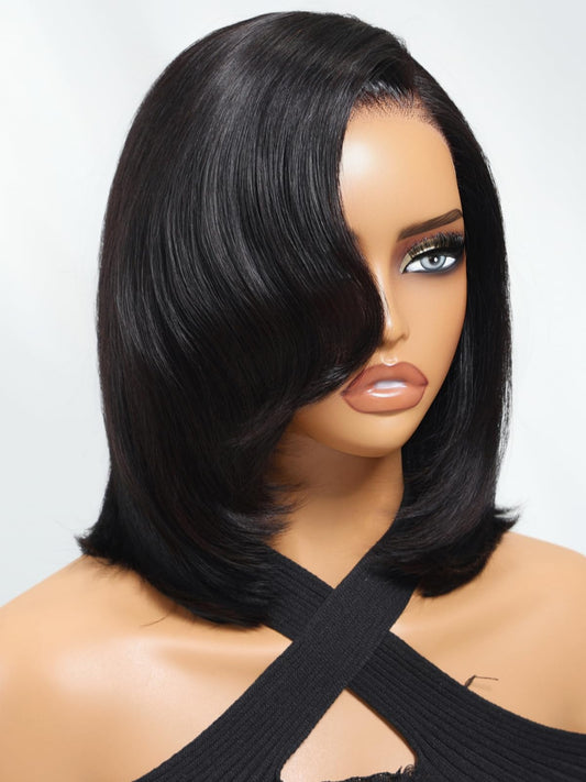 UNICE 8 inch Short Layered Bob Drawstring Wig Human Hair with Side Swept Bangs Bye Bye Knots 7x5 Lace closure Glueless Wigs Human Hair Pre Plucked Pre Cut Read to Wear