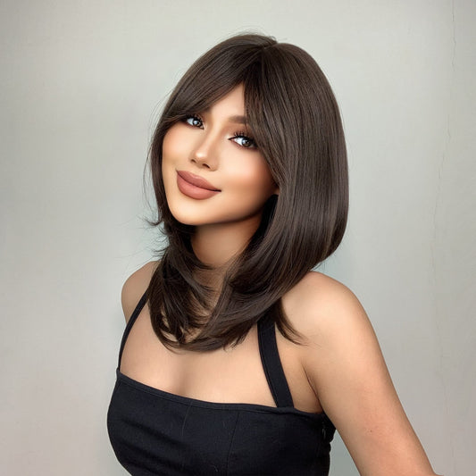Tumhorn Women Long Brown Wigs with bangs Natural Wavy Wigs Curly Hair Wig Heat Resistant Synthetic Wigs for Women