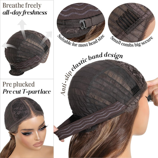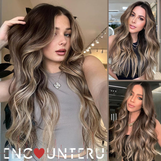 ENCOUNTERU Pre Cut Lace Glueless Wig Wear and Go Synthetic Lace Front Wigs for Women Brown and Blonde Highlight Body Wave Wig with Bangs Pre Plucked Ready to Wear Middle Part 26 Inch