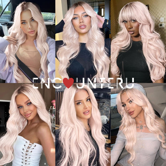 ENCOUNTERU Wear and Go Glueless Pink Wigs For Women Body Wave Wig with Bangs Synthetic Lace Front Pre Plucked Pre Cut HD Lace Glueless Ready to Wear Wig Light Pink Middle Part 26 Inch