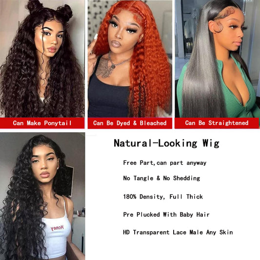 Deep Wave Lace Front Wigs Human Hair 180% Density 4X4 Transparent Lace Closure Wigs for Black Women Wet and Wavy Lace Frontal Wigs Glueless Wigs Pre Plucked with Baby Hair Natural Color (18 Inch)