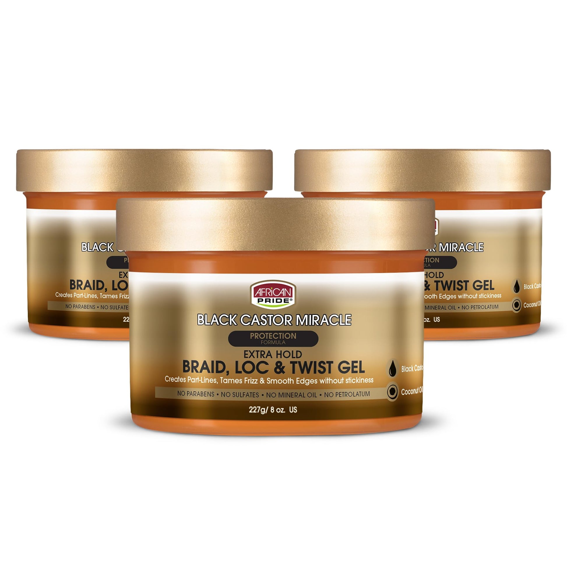 African Pride Black Castor Miracle Extra Hold Braid, Loc, Twist Gel - Extreme Hold Braiding Hair Gel, Edge Control & Tames Frizz, No Flake (Pack of 3) | Natural Ingredients, Coconut Oil | 8oz