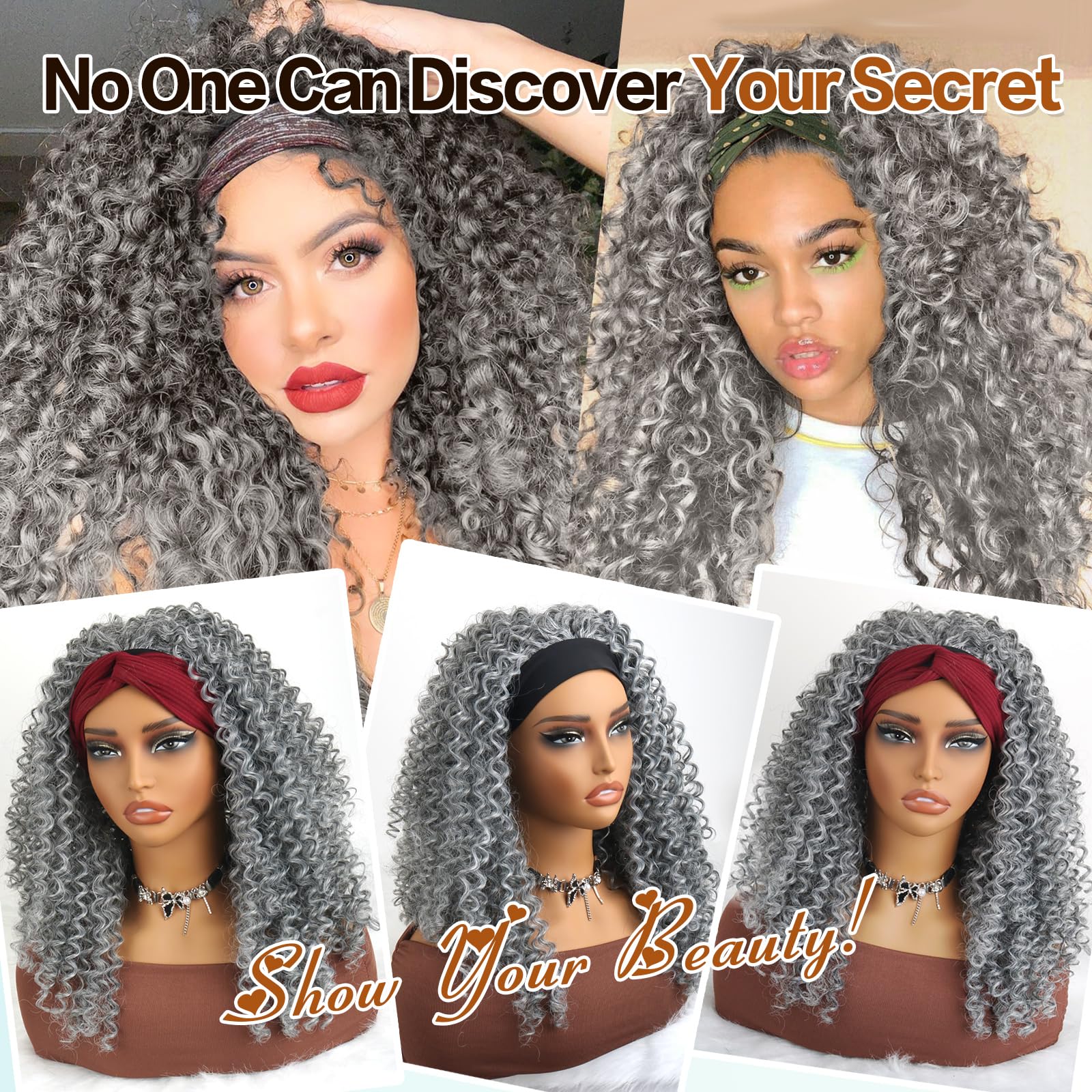 Aisaide Kinky Curly Headband Wig 16 Inch Headband Wigs for Black Women Gray None Lace Front Curly Wave Half Hair Wear and Go Glueless Wig
