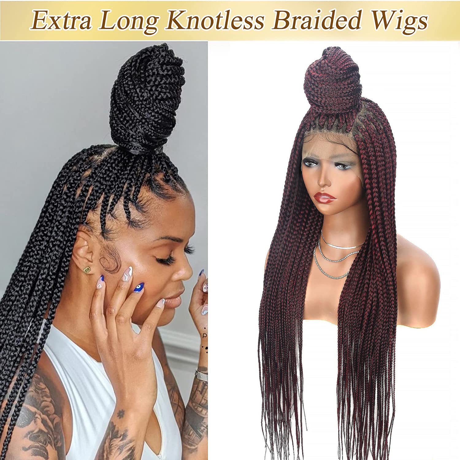 Alebery 36" Full Lace Knotless Box Braided Wigs for Black Women Knotless Box Braids Lace Front Wig with Baby Hair Lightweight Synthetic Lace Frontal Burgundy Cornrow Twisted Braided Wigs (1B/BG)