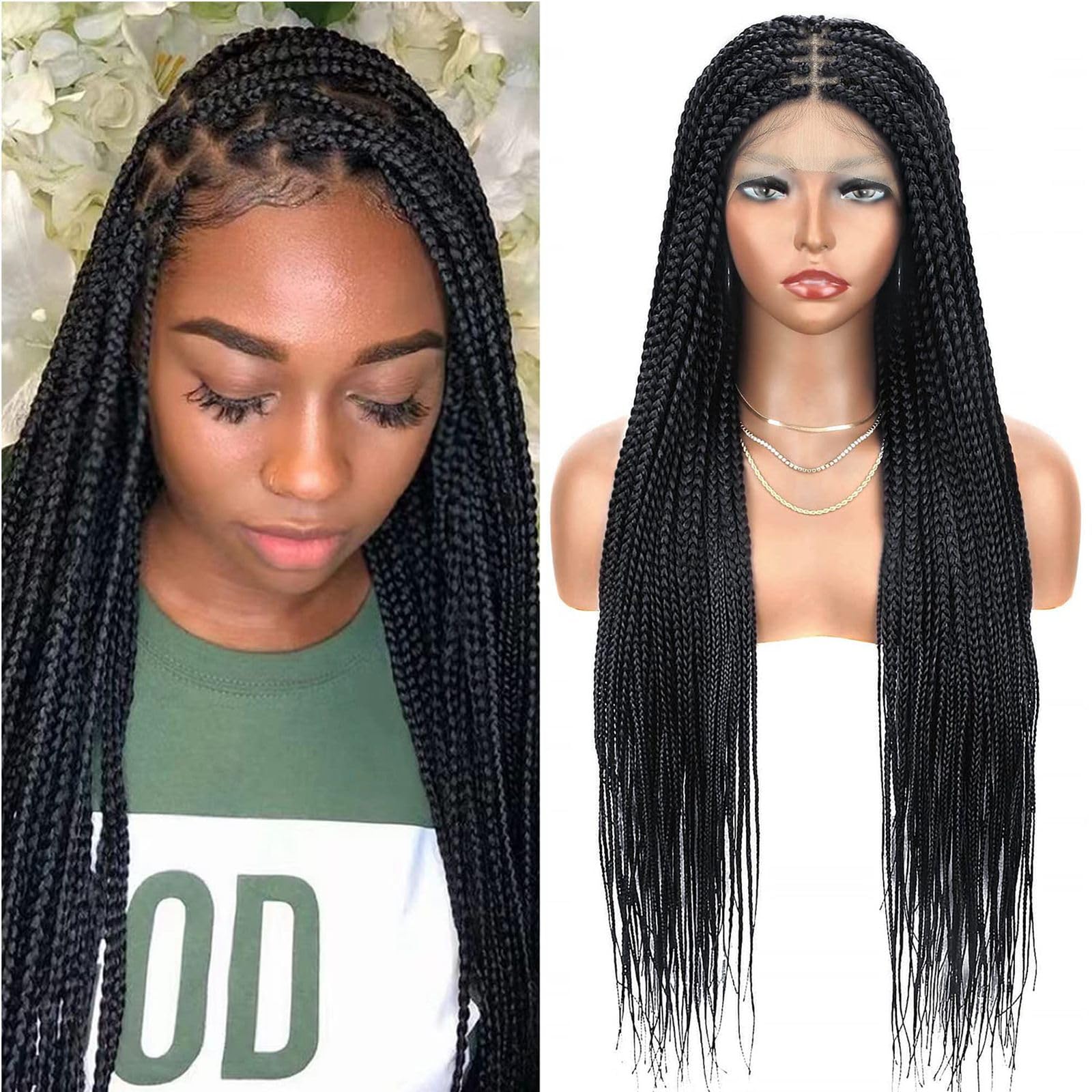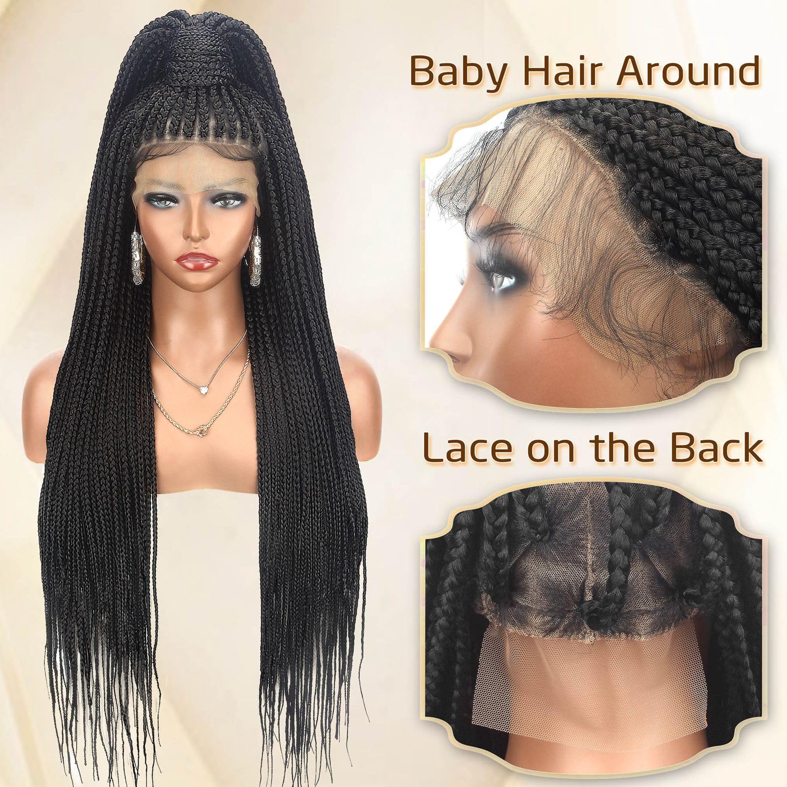 Alebery 36" Full Lace Knotless Box Braided Wigs for Black Women Twisted Braids Lace Synthetic Frontal Black Cornrow Wig with Baby Hair, Lightweight (1B)