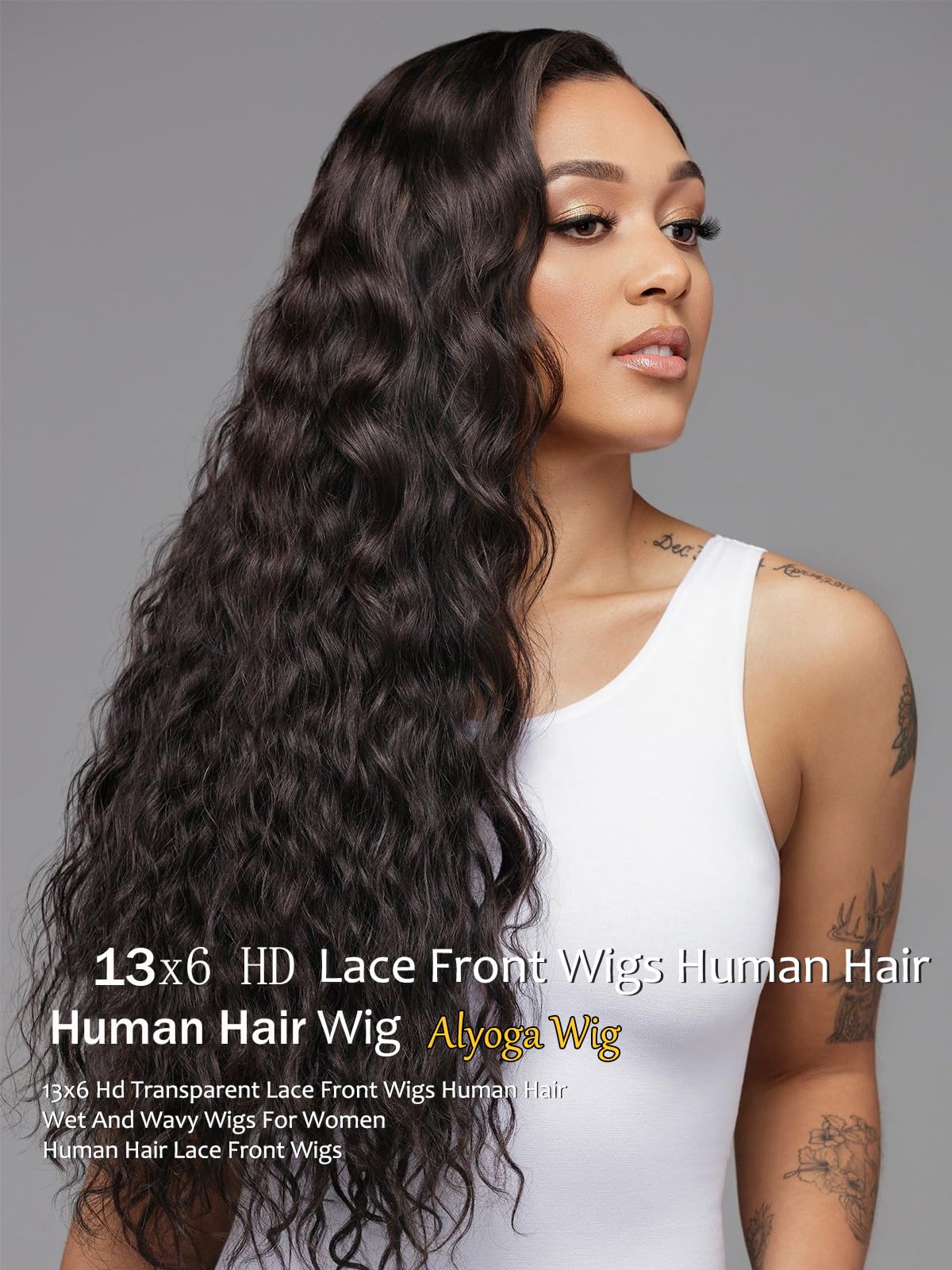 ALYOGA 13x6 Water Wave Lace Front Wigs Human Hair 200 Density Pre Plucked with Baby Hair Water Wave Wigs for Women Glueless Natural Color 24 inch