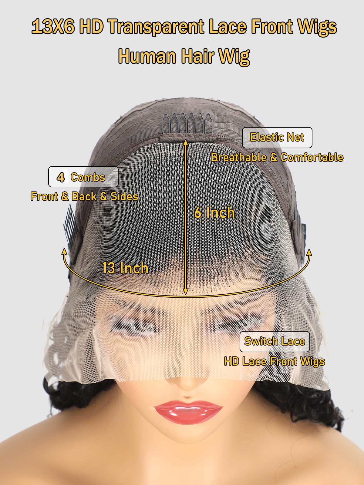 - Material: 13x6 HD transparent lace front wigs for women, 200 density curly human hair wig. 100% unprocessed Brazilian virgin human hair—soft, natural, healthy, and comfortable.