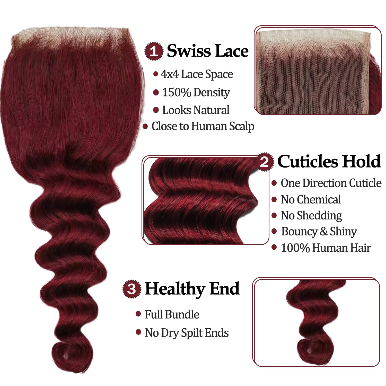 - Burgundy Bundles Human Hair with Closure Material: Unprocessed Brazilian Raw Human Hair Bundles with Closure, Loose Deep Wave Bundles with 4x4 Free Part Lace Frontal Closure, 99j Burgundy/Wine Red Color. Be Cut From Young Girl Donors Directly, Clean, Healthy, Safe, Strong, Soft, Natural
