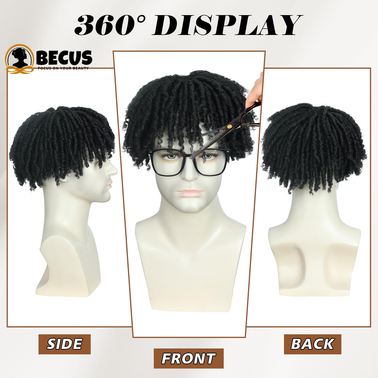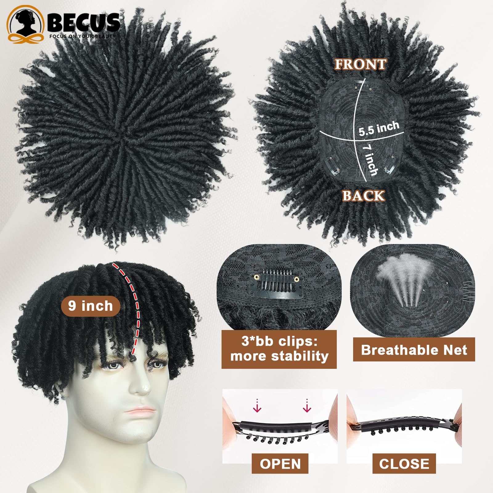 BECUS Topper Dreadlock Hairpiece for Black Men, Short Afro Fake Dreads Braids Clip In Toupee with Clips, Hairpieces for Thinning Hair, Daily Wear Halloween Cosplay Costume Party(Black-Toupee)