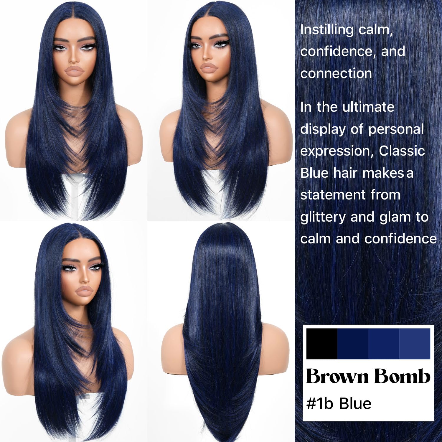 BrownBomb Dark Blue Wear and Go Glueless Wigs Pre Plucked Pre Cut for Beginners Synthetic Lace Front Wig for Woman Long layered Straight Wigs with Bangs 26 Inch 3 Seconds to Wear for Beginners