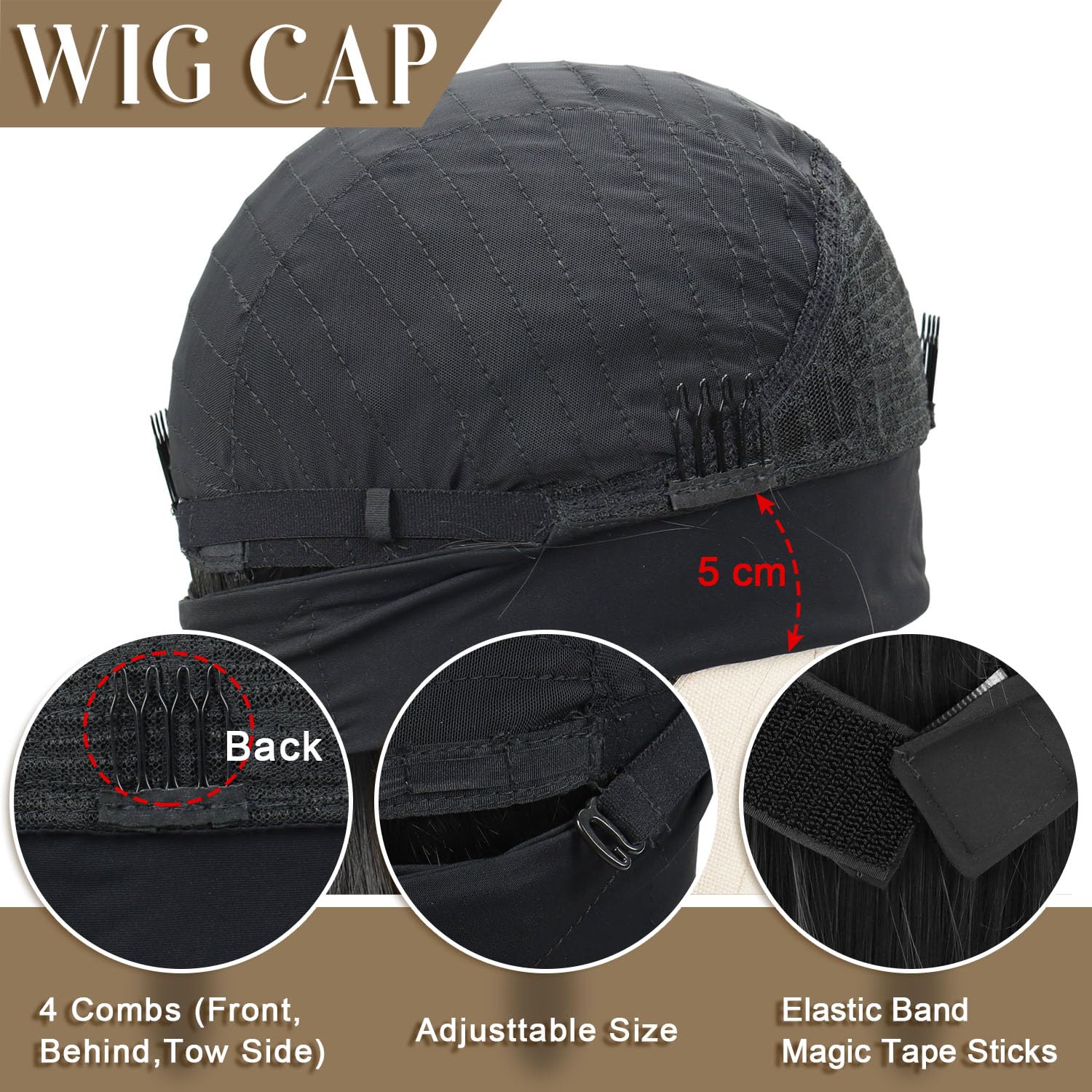 - Wig Cap Size: Our long wavy headband wigs use breathable elastic cap medium size 22”-22.5”. Headband wigs glueless magic tape sticks snapping design with 4 combs and adjustable straps, which could help you to adjust the elastic cap to more suitable and comfortable