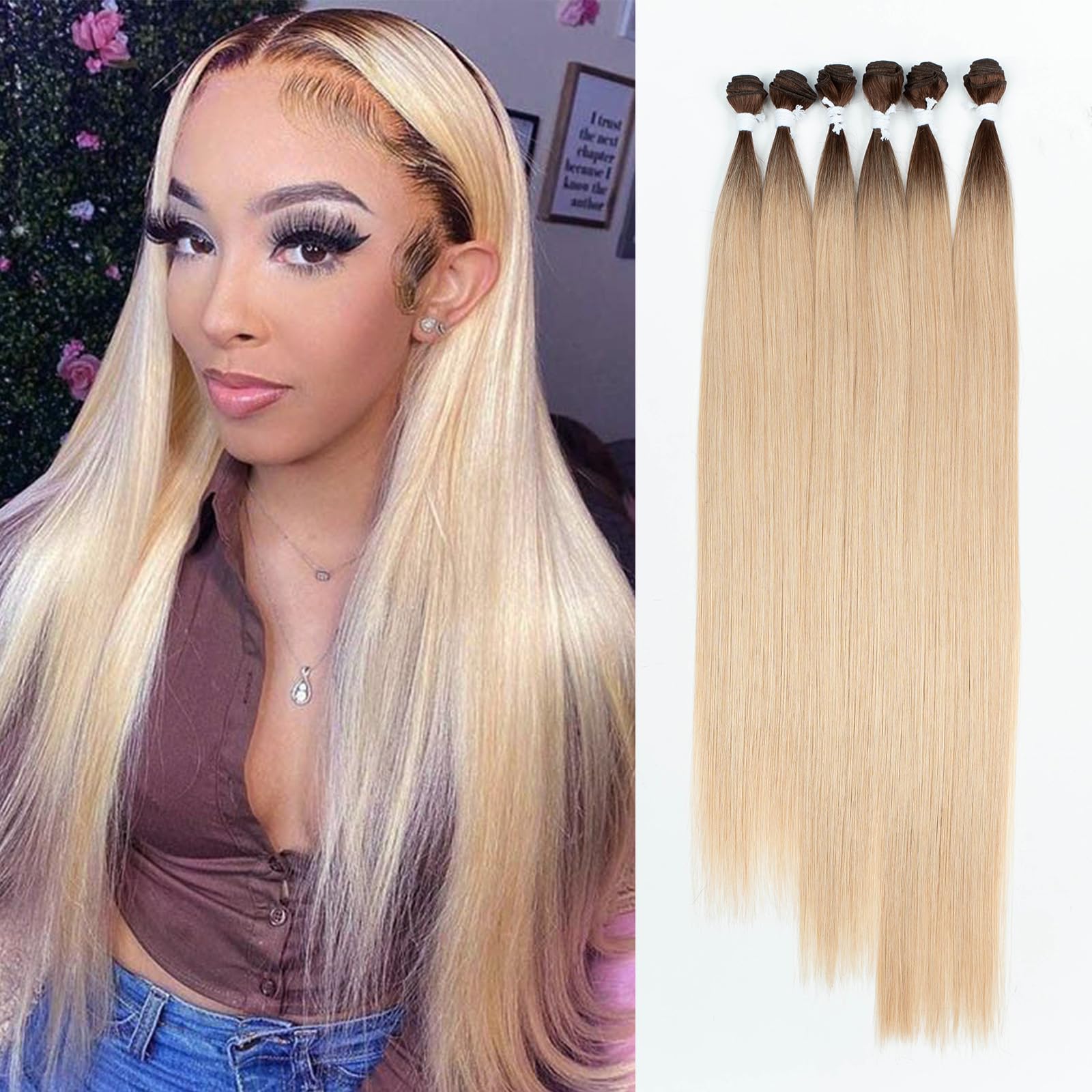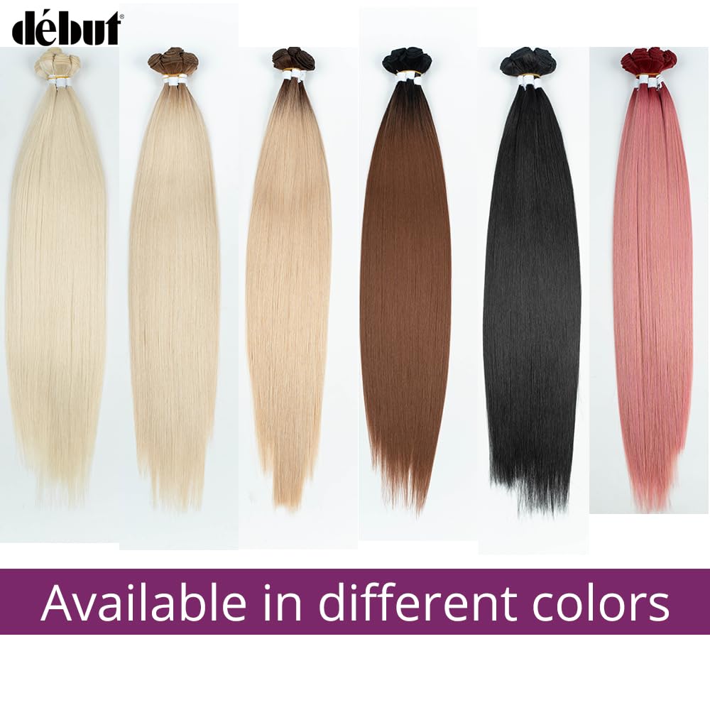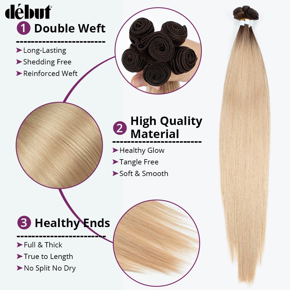 DÉBUT 26 28 30 Inches Long Straight Hair 6 Bundles High Temperature Fiber 300g for Full Head Synthetic Hair Weave Ombre Brown Roots to Blonde