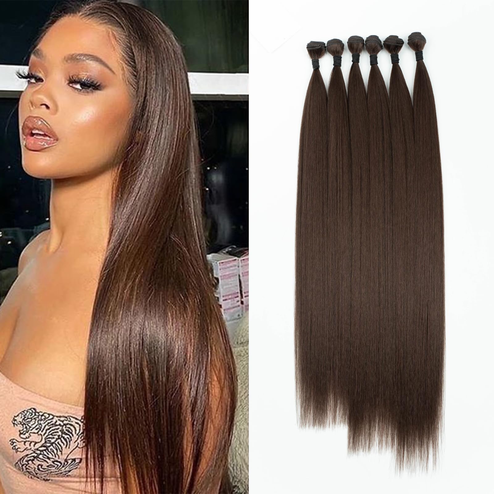 DÉBUT Long Straight Hair 6 Bundles High Temperature Fiber 300g for Full Head Synthetic Hair Weave Medium Brown 26 28 30 Inches