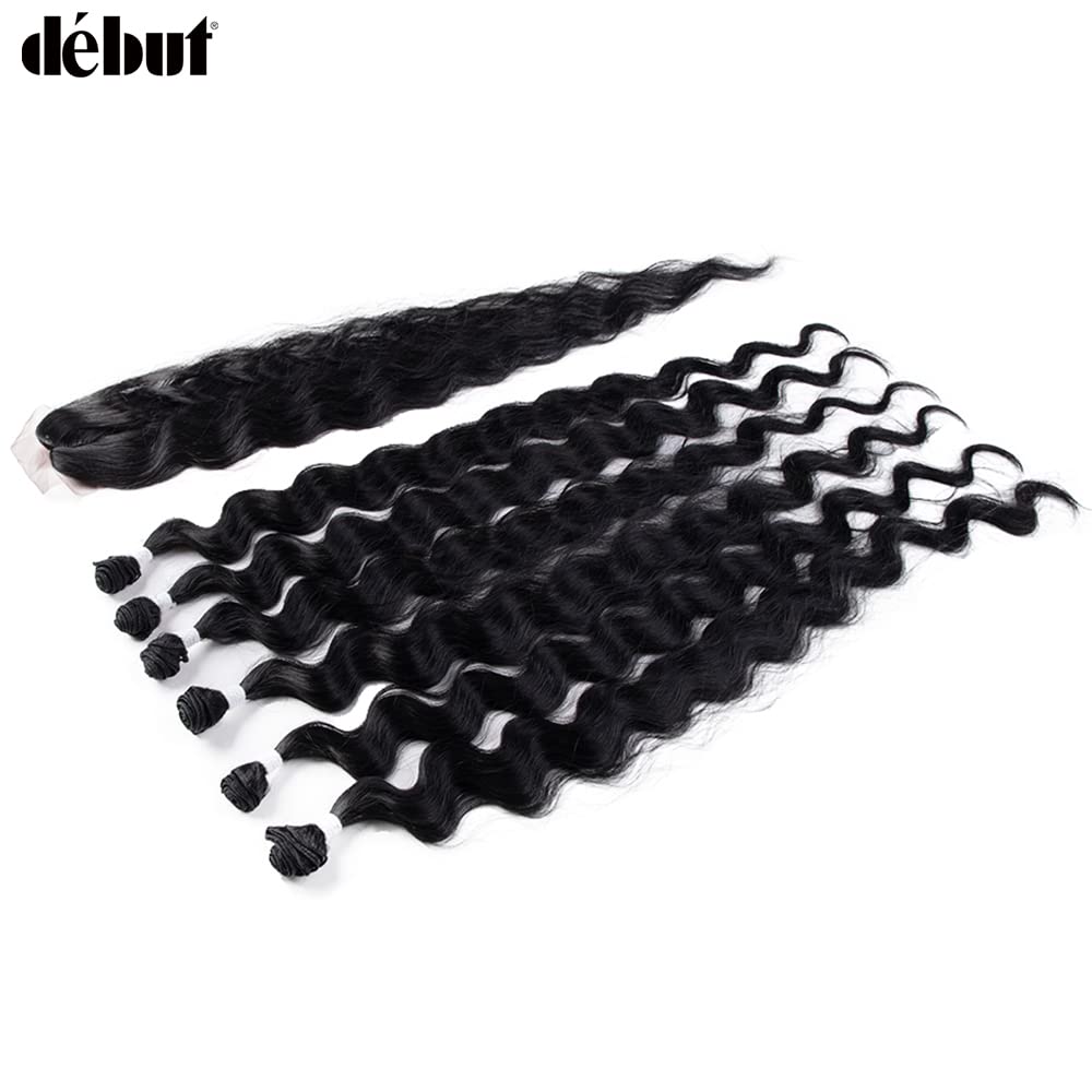 DÉBUT Wavy Long Synthetic Hair 6 Bundles with Easy Closure Body Wave High Temperature Fiber Hair Weave 7PCS 320g 1B Color