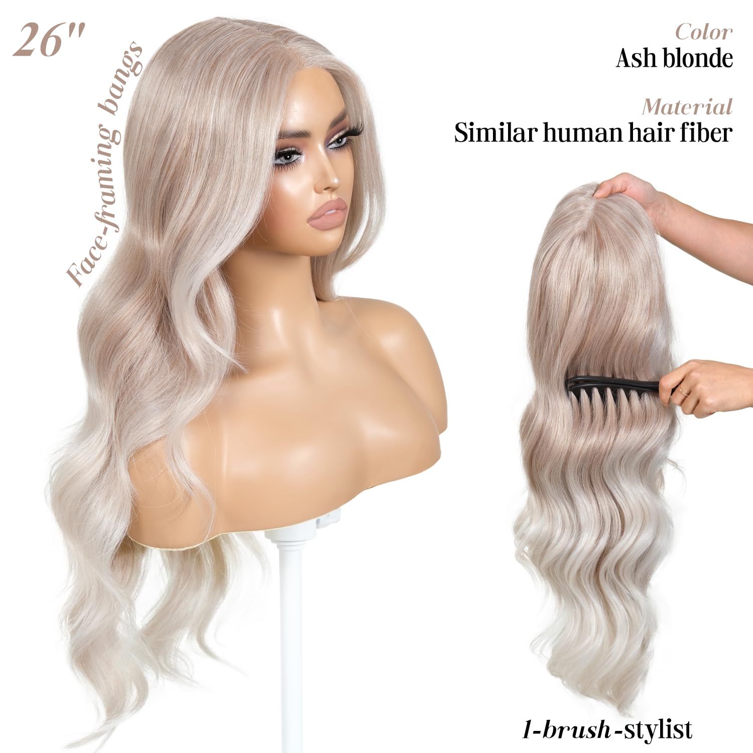 ENCOUNTERU Ash Blonde Wear and Go Glueless Wig with Bangs Synthetic Lace Front Wigs for Women Body Wave Pre Plucked Pre Cut HD Lace Glueless Ombre Wig Middle Part 26Inch