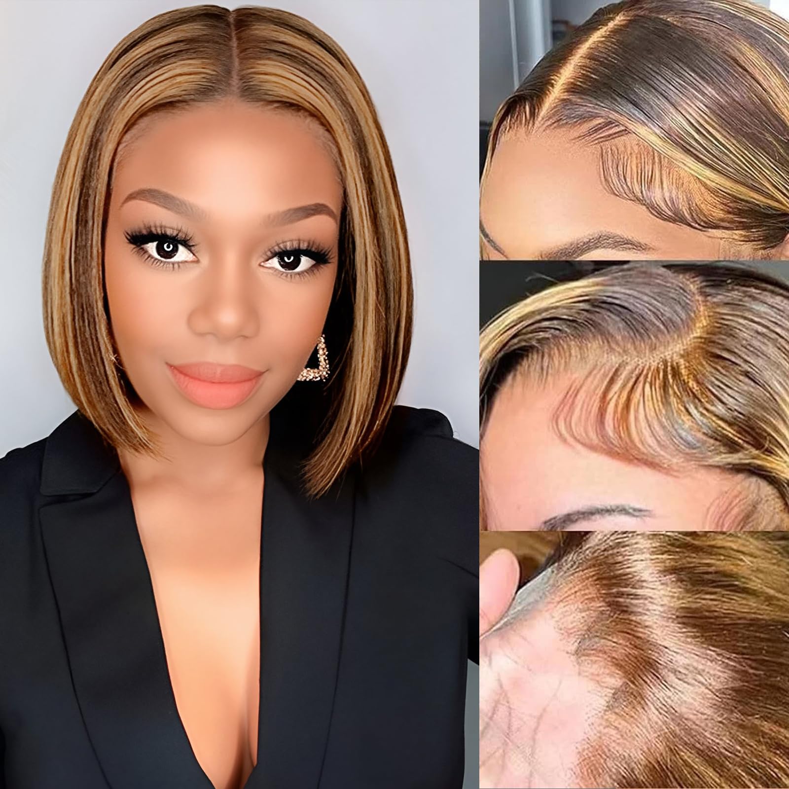 Highlight Wig Human Hair Honey Blonde Ombre Lace Front Wig Straight Gradient Color Real Hair Wigs for Women Pre Plucked With Baby Hair Honey Gold HD Stretchy Glueless Bob Wigs 180% Density 12 Inch