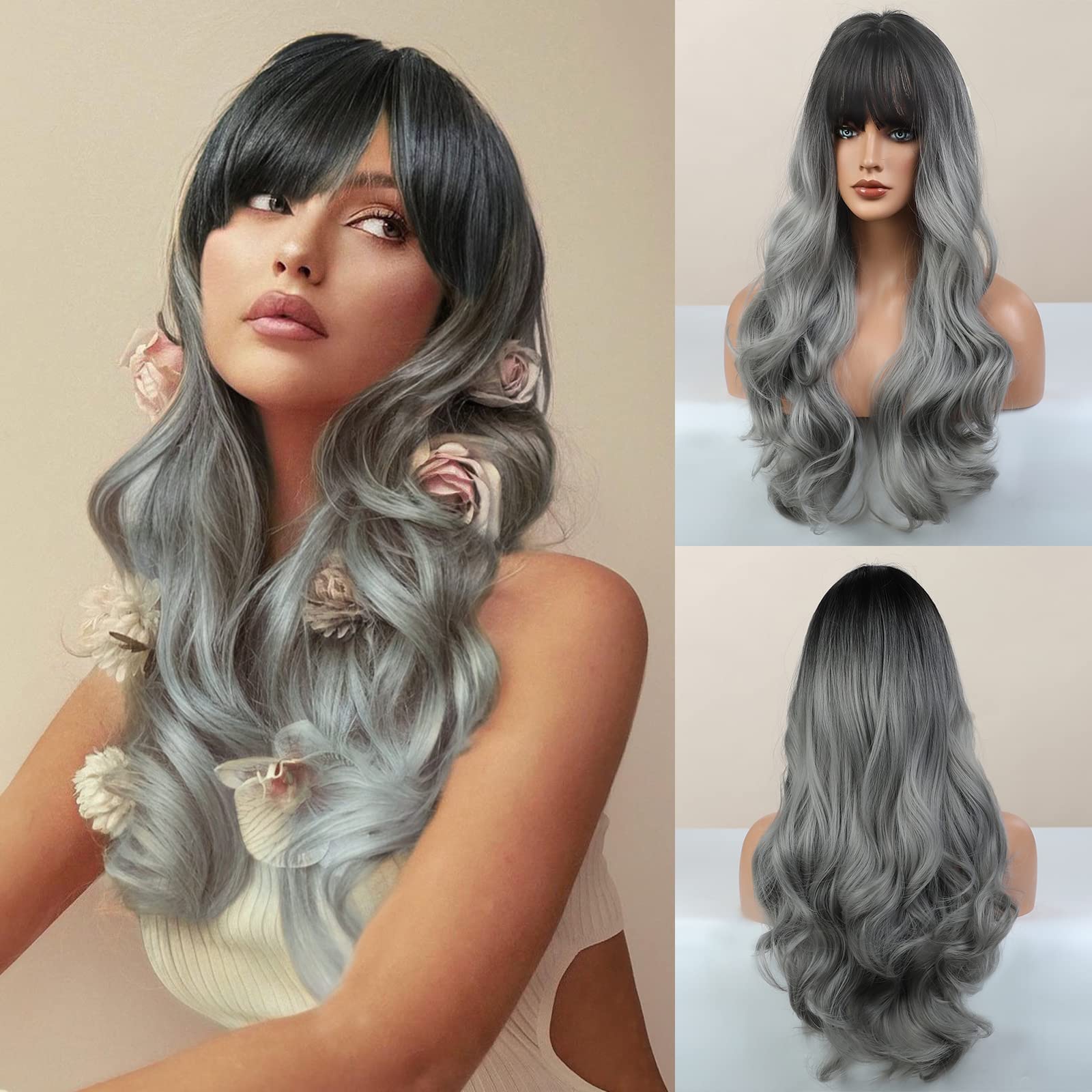 Honygebia Grey Wig with Bangs - Ombre Gray Wigs for Women, Long Wavy Layered Black Root Realistic Hair, Natural Synthetic Heat Resistant Wigs for Halloween/Christmas/Cosplay/Party
