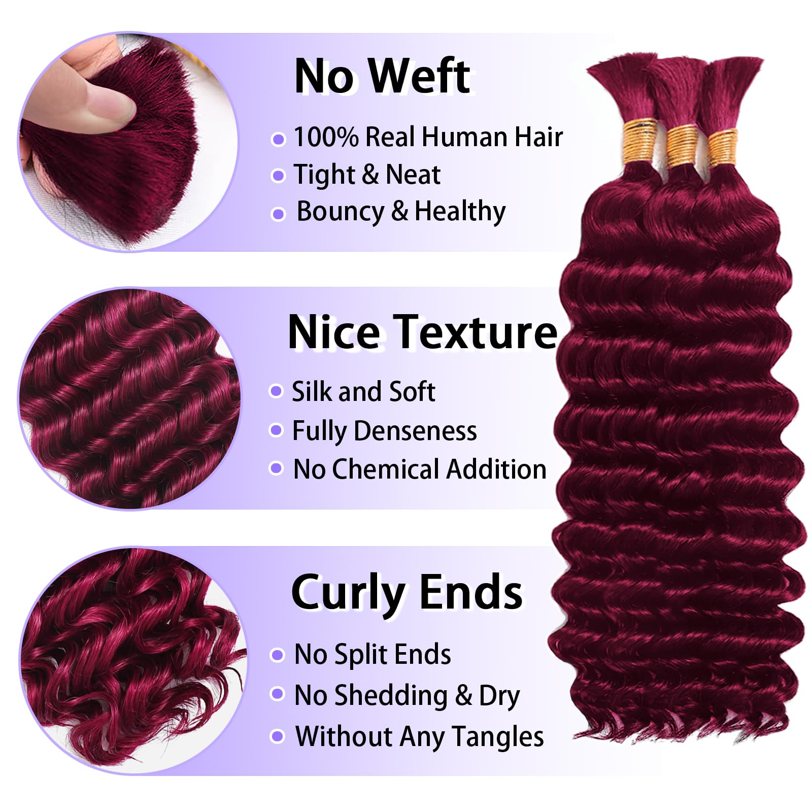 Human Braiding Hair for Boho Braids Human Hair 3 Bundles/Pack 110g 16 Inch Deep Wave Bulk Human Hair for Braiding Curly Knotless 12A Brazilian Virgin Burgundy