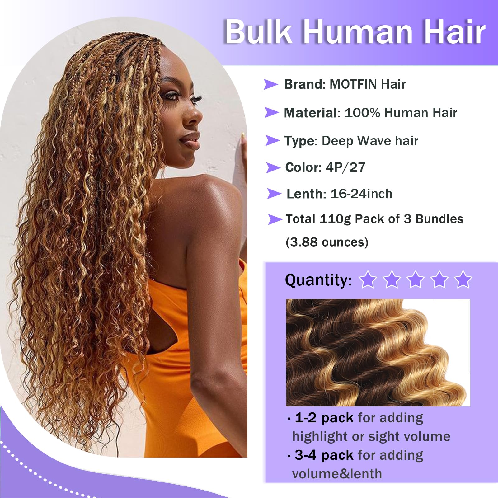 Human Braiding Hair for Boho Braids Human Hair 3 Bundles/Pack 110g 20 Inch Deep Wave Bulk Human Hair for Braiding Curly Knotless 12A Brazilian Virgin Ombre Balayage