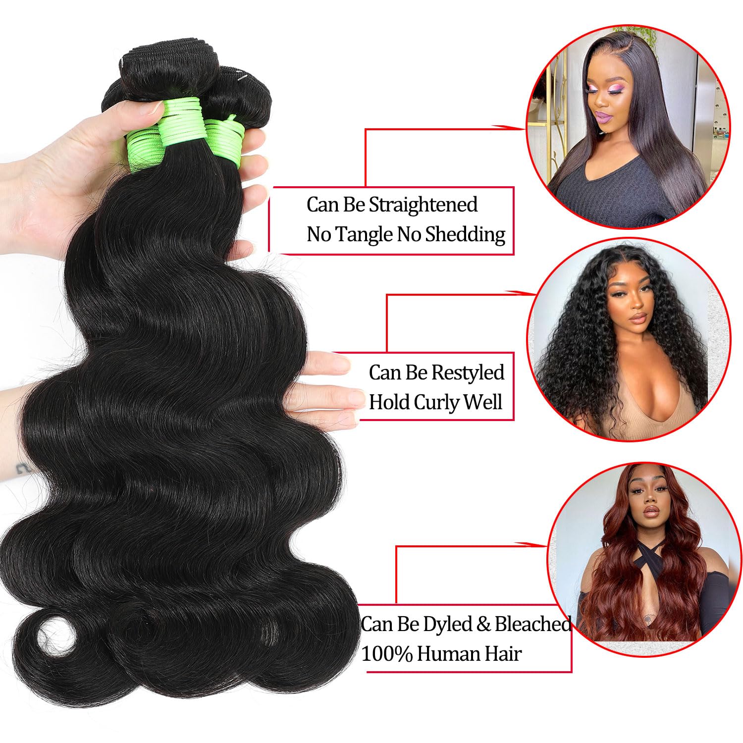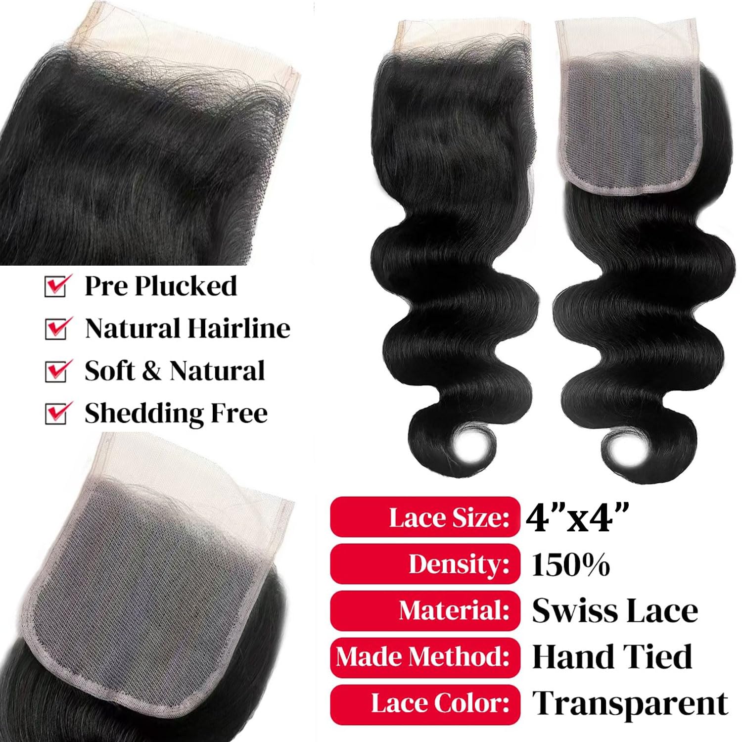 - Body Wave Hair Quality: 1B Natural Black Bundles with Closure. Hair Weft is 100(+/-5)g/bundle, Lace Closure is 20-40g Depending on the Length. 150% Density 4×4 Free Part Closure, Hair is Soft, Full and ThickDouble Weft,Full & Thick ,No Tangle & Shedding,Can be Straightened,Curled, Bleached and Restyled as Your Own Hair.