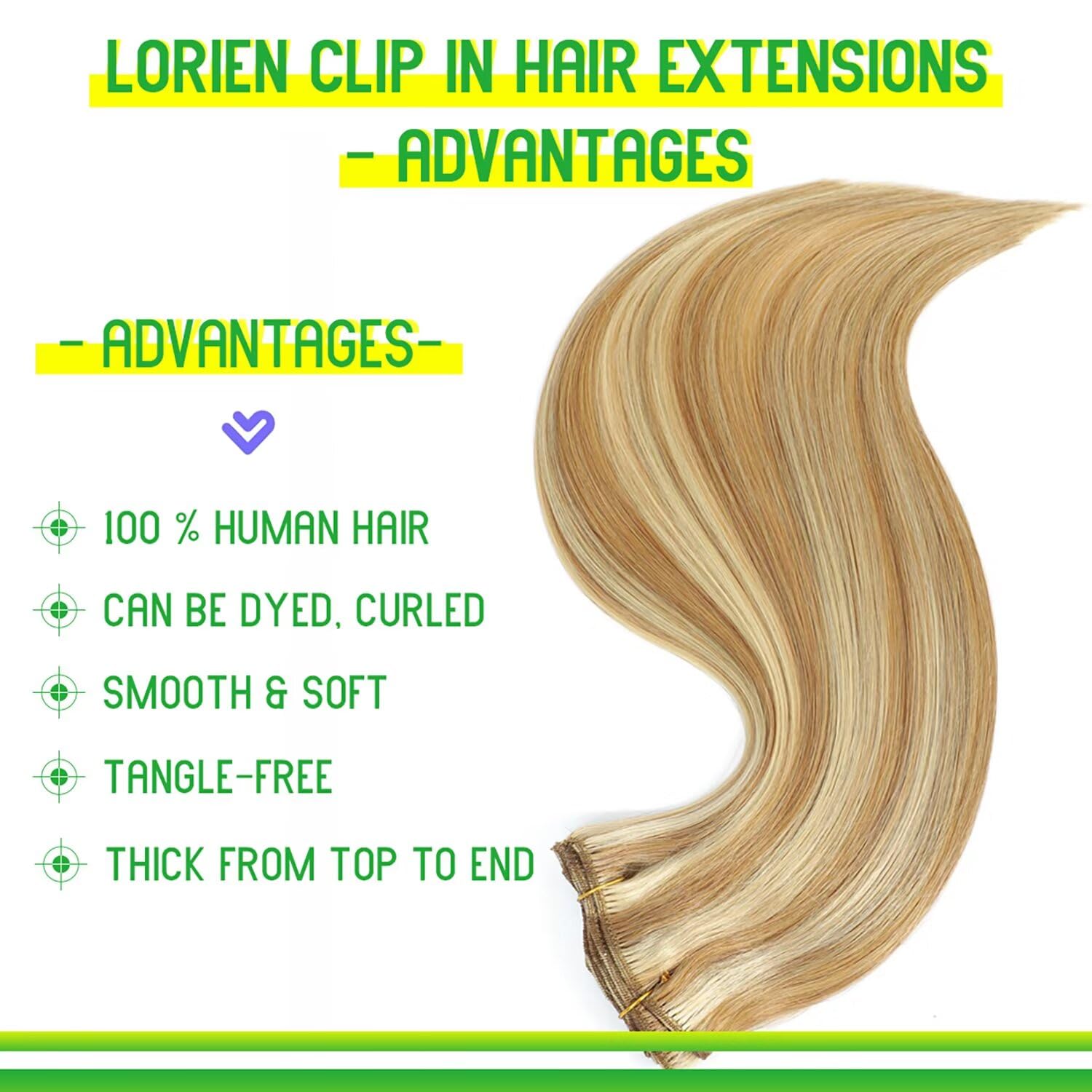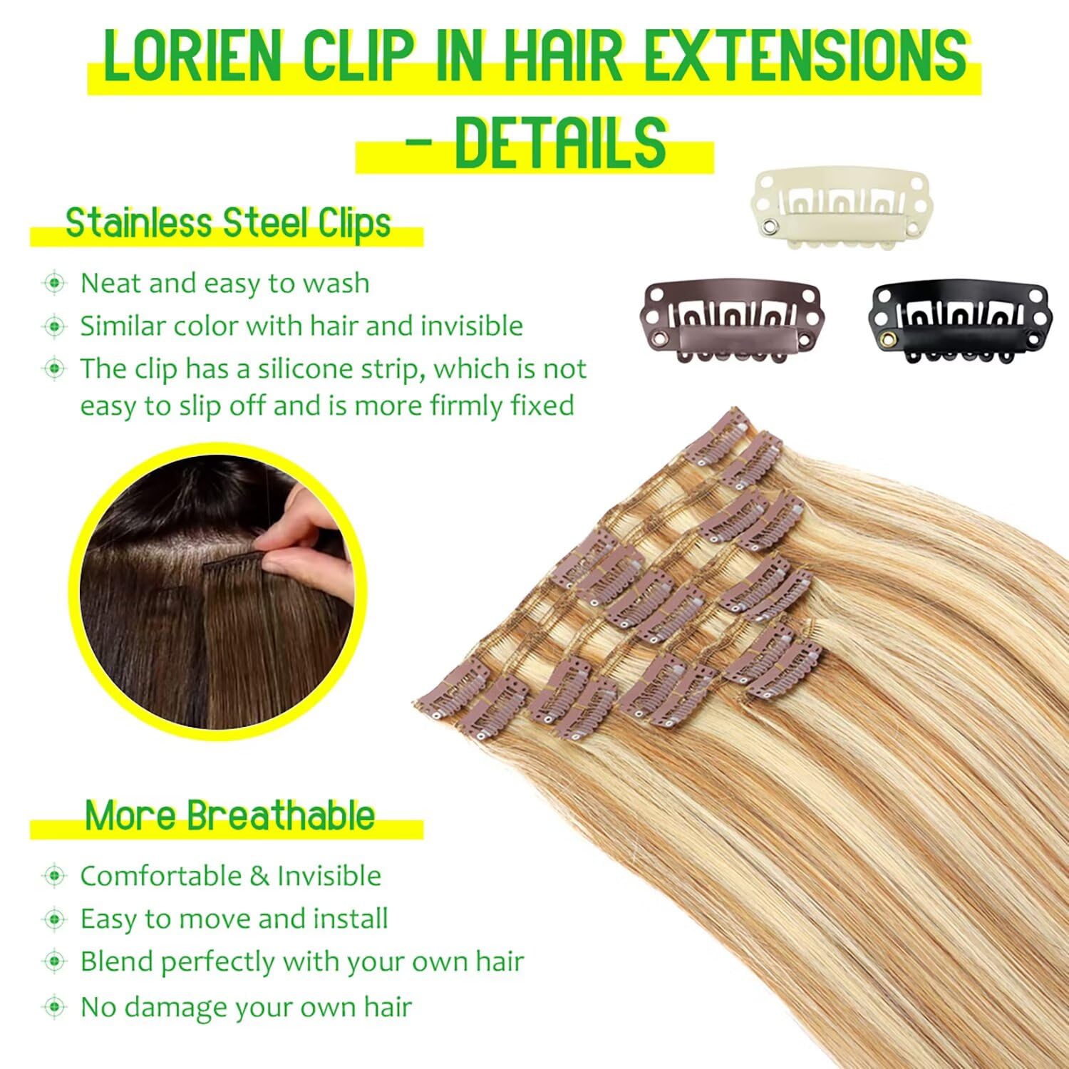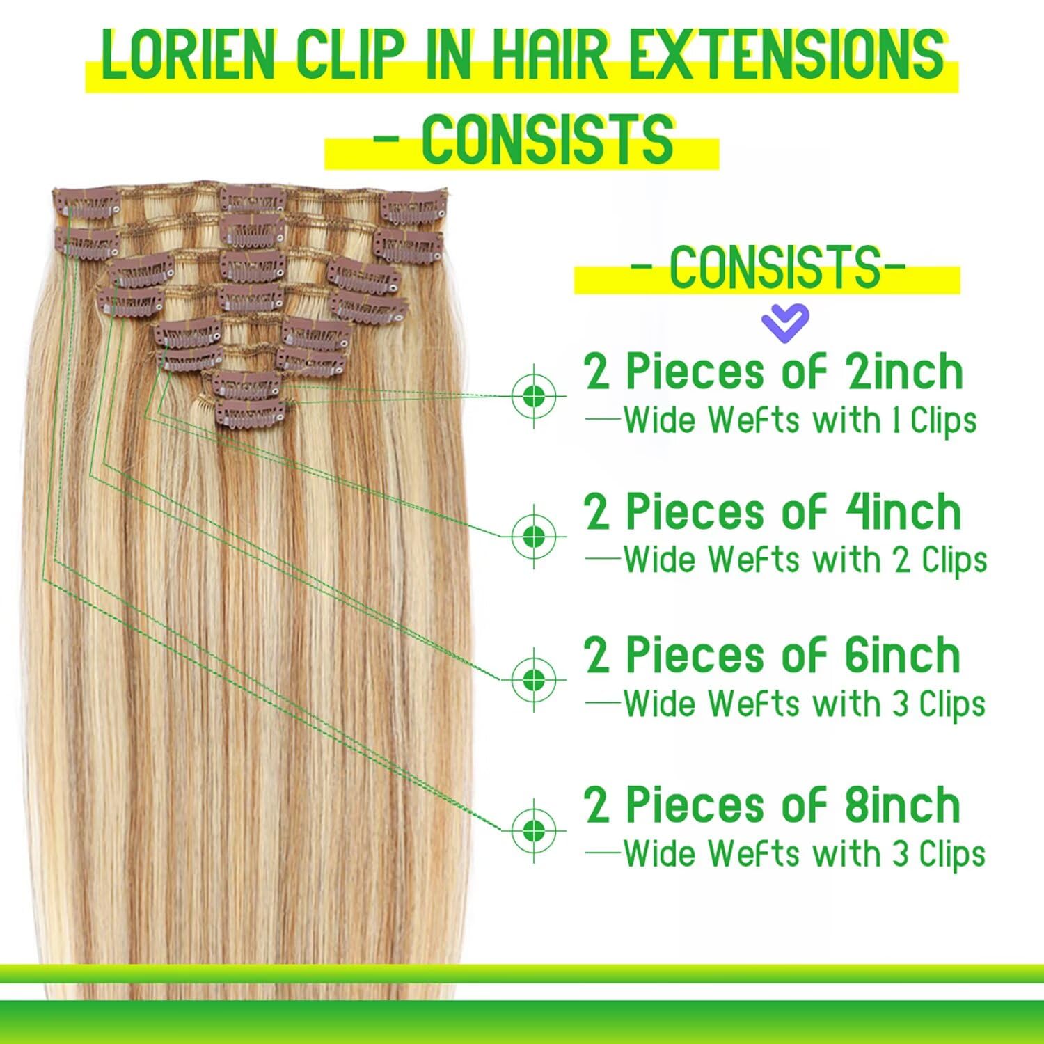 LORIEN Clip in Hair Extensions Real Human Hair Clip in 100% Human Hair Extensions Brazilian Remy Human Hair Clip on Hair Extensions 8pcs Per Set with 18Clips Double Weft