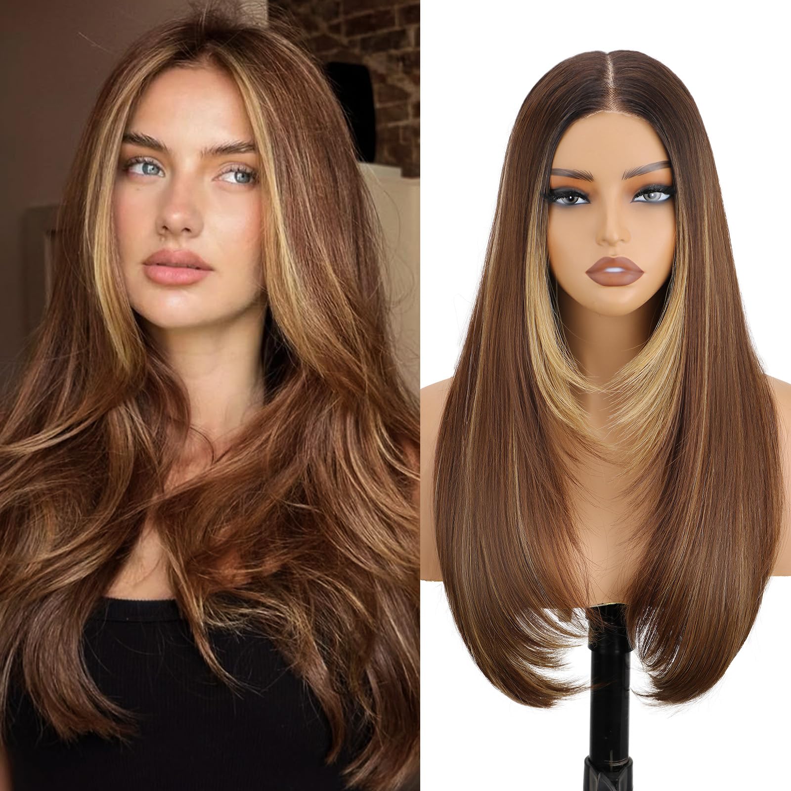 NOSTALGIA Honey Blonde Highlight Straight Lace Front Wig Pre Cut Glueless Synthetic Layered Wig 24 Inch Middle Part Closure Wig For Women Upgraded with Premium Fiber